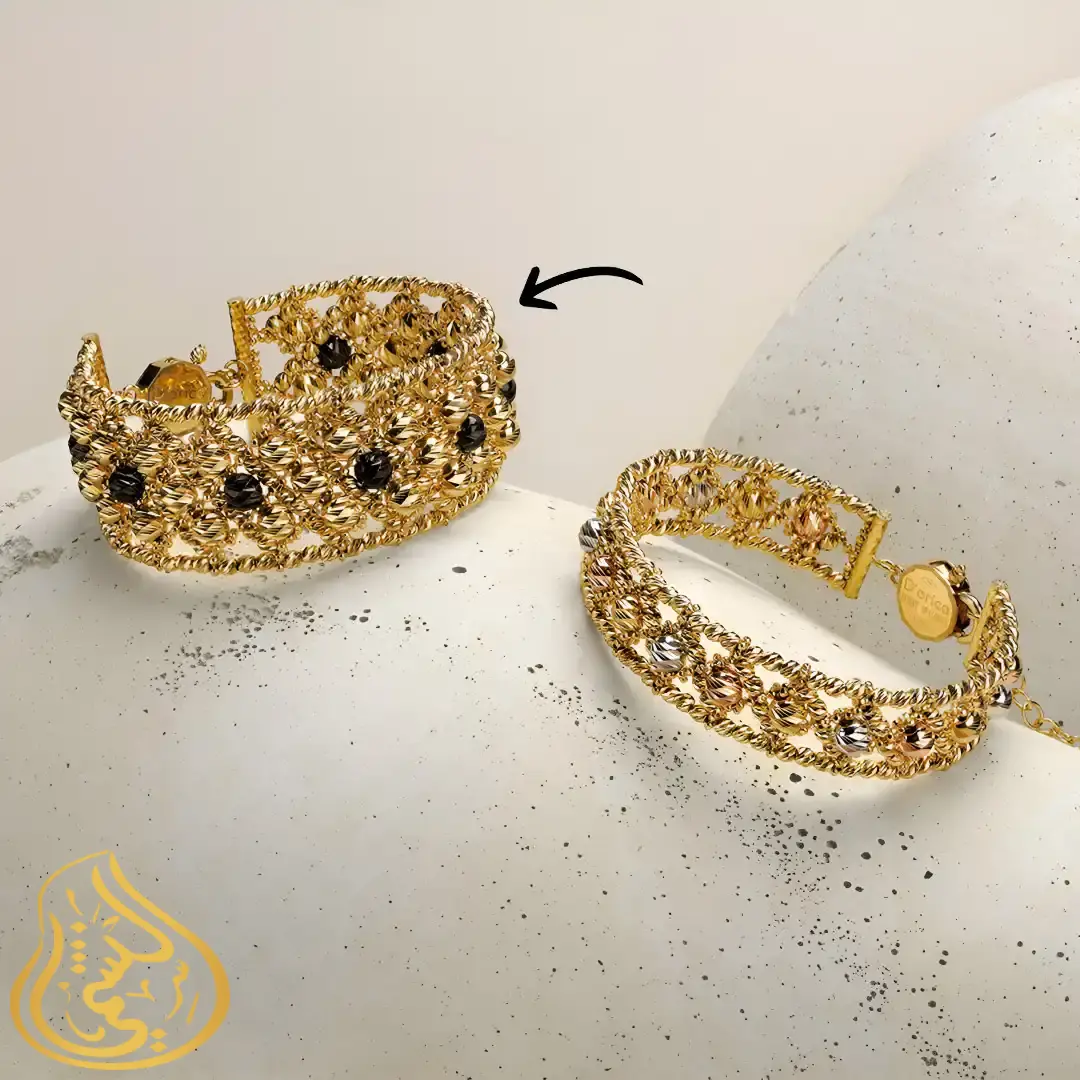 أسوارة عريضة بتصميم عصري يخطف الأنظار، مزينة بكرات سوداء أنيقة تمنحها لمسة فريدة وجريئة. مزيج مثالي بين الفخامة والحداثة، لتكمّلي بها إطلالتك بأسلوب يعبّر عن شخصيتك القوية والراقية.