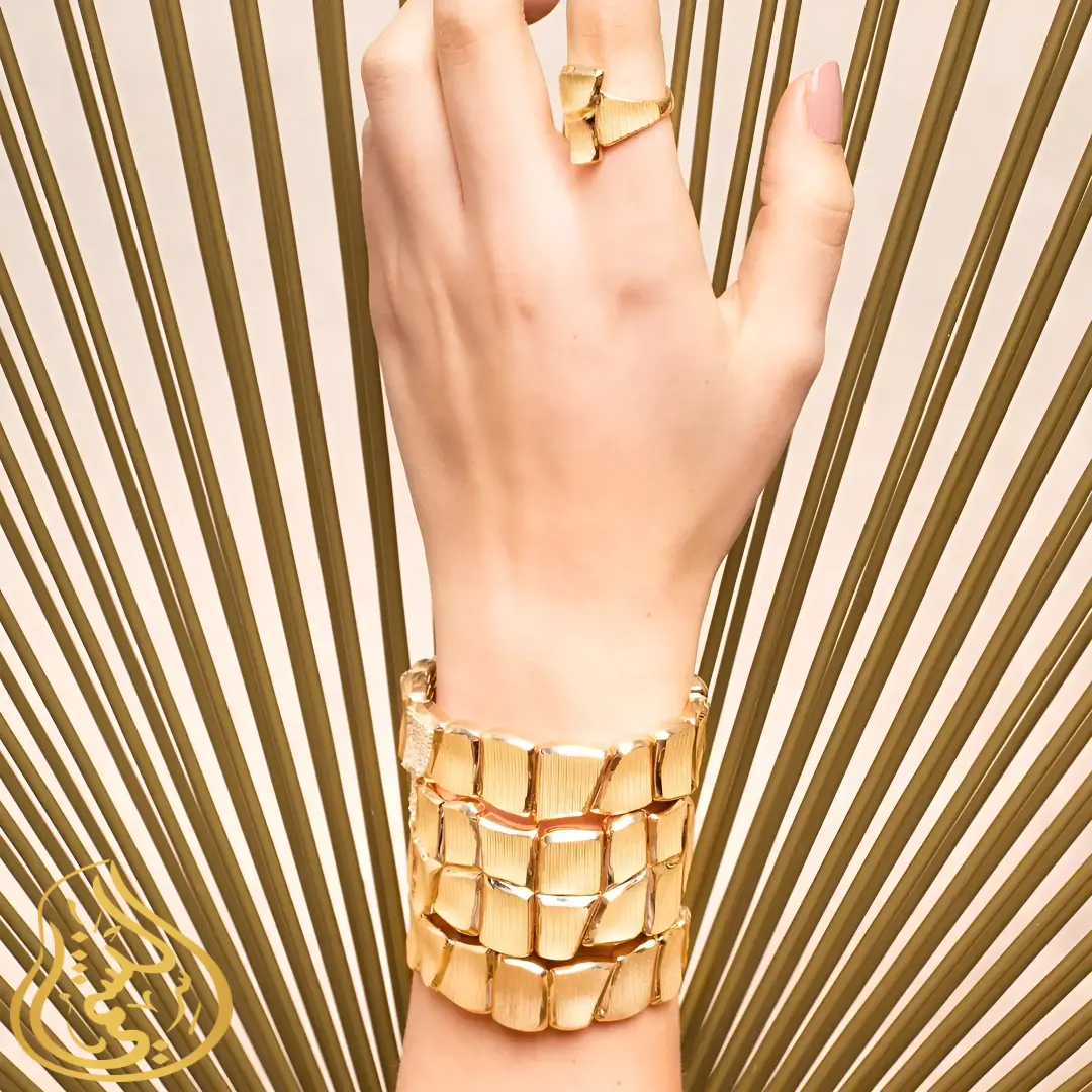 نصف طقم يجمع بين الفخامة واللمسة العصرية، يتكوّن من أسوار وخاتم بتصميم ثقيل يلفت الأنظار ويمنحك حضوراً مميزاً. التفاصيل مصمّمة بعناية لتجمع بين الأناقة الراقية والطابع العصري الجريء، ليكون هذا الطقم خيارك الأمثل لإطلالة واثقة ومبهرة.